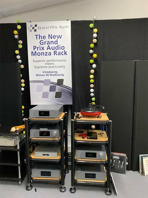 Grand Prix Audio spielte mit dem GPA v2.0 Monaco und FUUGA Tonabnehmer zusammen mit CH Precision Elektronik und APERTURA Lautsprechern. Die Laufwerke von Grand Prix Audio sind natürlich im Normalfall schwarzes Kohlefaser-Epoxy-Compound. Hier wurde ein Exemplar auf Wunsch aus Asien überlackiert, was m. E. rein optisch die Wertigkeit reduziert. |